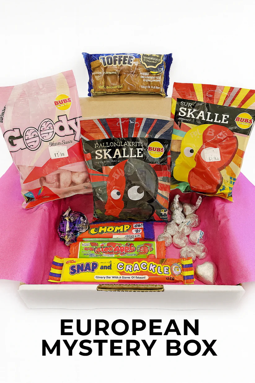 Discover a surprise selection of sweet treats with our European Mystery Box! Each box is packed with a delightful mix of European and English classics, from chewy toffees and fruity gummies to nostalgic chocolate bars.
