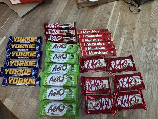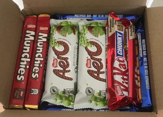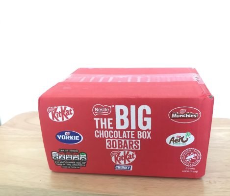 The box is full to the brim with Nestl¨¦ ,Chocolate Bars, 30 of them ¨C KitKat, KitKat Chunky, Yorkie, Aero, Munchies